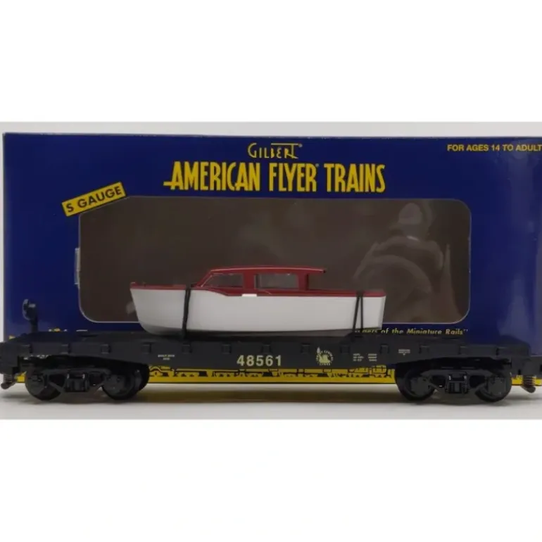 Here is an American Flyer 6-48561 S Scale Central Railroad of New Jersey Flatcar w/Boat. Features: Die-cast metal trucks and operating couplers Metal frame Removable boat load Gauge: American Flyer/S Gauge Dimensions: Length: 8 3/8 RailLine: Central of New Jersey