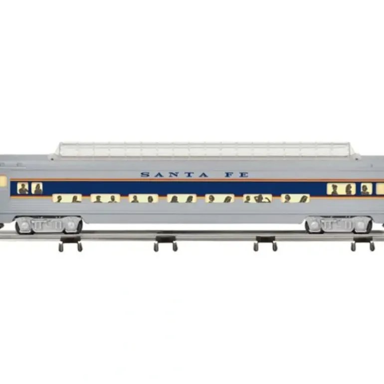 This is an American Flyer 6-49940 S Scale Santa Fe Full Vista Dome Passenger Car. Exciting new American Flyer cars feature a realistic and distinctive bi-level window configuration on one side of the car and single level configuration on the opposite side. The full vista dome car will look great and turn heads as it makes its way down the rails in your existing passenger set Die-cast metal trucks and operating couplers Stamped metal frame Window silhouettes Interior illumination Unique window configuration on each side of car