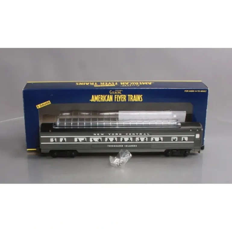 This is an AF 6-49942 S Scale New York Central Full Vista Dome. Exciting new American Flyer cars feature a realistic and distinctive bi-level window configuration on one side of the car and single level configuration on the opposite side. The full vista dome car will look great and turn heads as it makes its way down the rails in your existing passenger set Die-cast metal trucks and operating couplers, Stamped metal frame, Window silhouettes, Interior illumination, Unique window configuration on each side of car