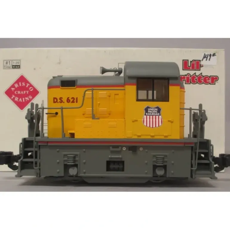 Here is an Aristo-Craft 22503 G Scale Union Pacific Lil’ Critter Diesel Locomotive #621. Features of the locomotive include a powerful motor, realistic detail, operating, headlight, plastic operating knuckle couplers, fully detailed sprung trucks, cab interior detail with figure, metal handrails, metal wheels and axles.