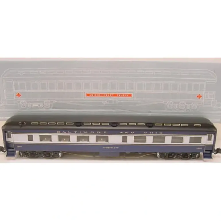 This is an Aristo-Craft 31502 Baltimore and Ohio “Cumberland” Heavyweight Diner Car. Features include operating AAR design knuckle couplers, detailed passenger car trucks/wheelsets with metal wheels, moveable vestibule doors, solid-state electrical circuit, operating interior lights, fully detailed interior with chairs, tables and kitchen, removable roof, full underframe, realistic painting and authentic detailing, brass grab railing, including air brake system components and clear plastic windows with bridgework trim. It measures 33 inches long from coupler to coupler.