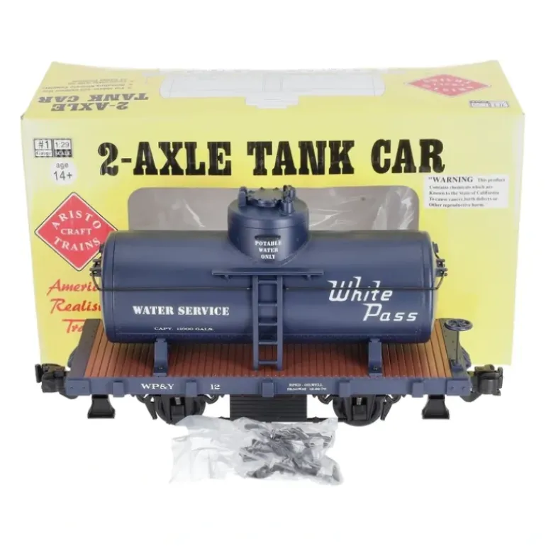 Here is an Aristo-Craft 40115 WP&Y 20′ Tank Car. Features: – Front / Rear Operating AAR Knuckle Couplers – Full Underframe Including Air Brake Components – Detailed Freight Car Trucks & Wheelsets w/ Springs – Blackened Brass Grab Railings – Realistic, simulated wood grain on sides & ends – Realistic Painting & Authentic Detailing.
