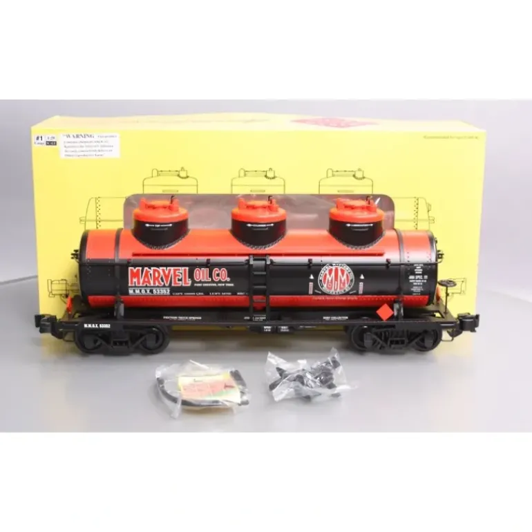 Here is a Aristo-Craft 41611 G Marvel Oil 3 Dome Tank Car Triple. Features: – Front/Rear Operating AAR-Design Knuckle Couplers – Detailed Freight Car Trucks and Wheelsets w/ Springs – Moveable Hatch Cover on Domes – Full Under frame, includes Air Brake System Components – Set of 4 (6 Designs) Full Color Placards – Brass Grab Railings – Realistic Painting & Authentic Detailing.
