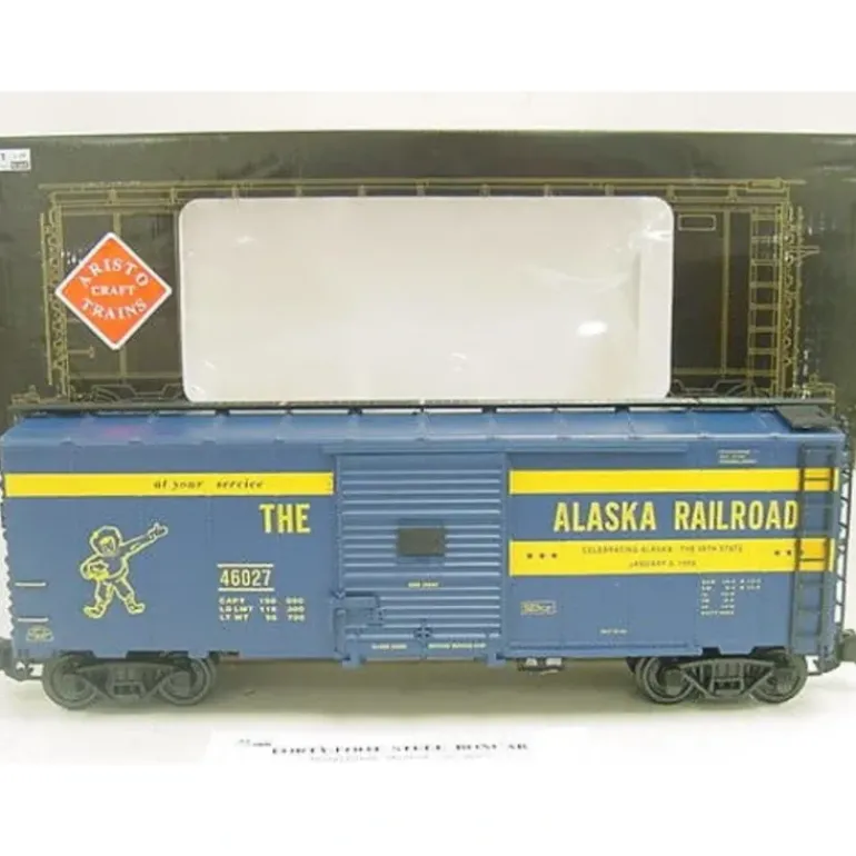 Here is an Aristo-Craft 46027 G Scale Alaska Railroad Boxcar. This freight car features Front / Rear Operating AAR Knuckle Couplers, Detailed freight car trucks / wheelsets with individual springs, Operating doors with moveable latch, Three-dimensional ladders on ends and sides, BRASS grab-railings and simulated WOOD-GRAIN flooring, Full Under frame, including Air Brake System components, Realistic painting and authentic detailing. MINIMUM 4′ DIAMETER CURVE REQUIRED