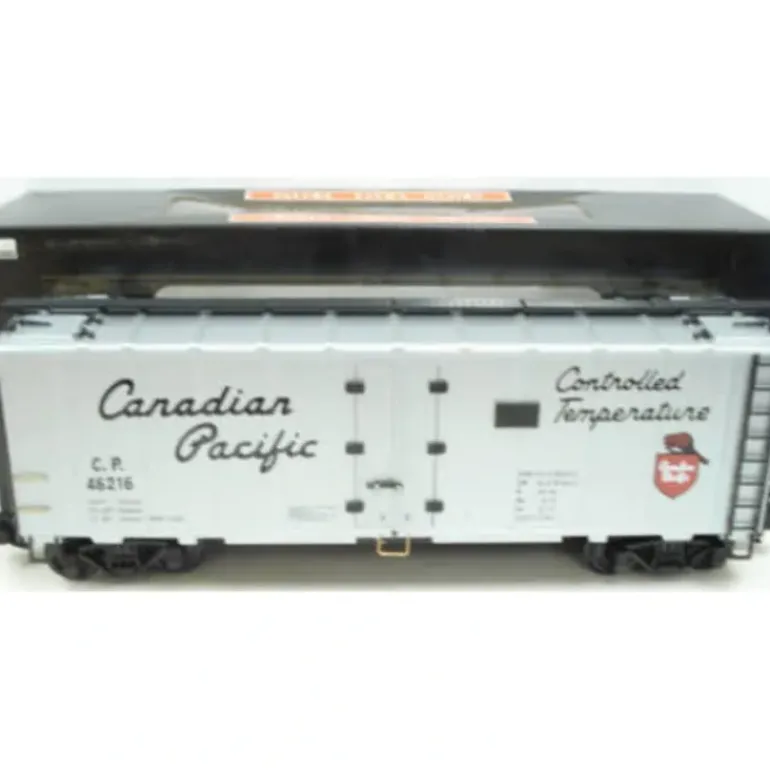 This is an Aristo-Craft 46216 Canadian Pacific Reefer. This car features plastic trucks, Front / Rear Operating AAR Knuckle Couplers – Detailed freight car trucks / wheelsets with individual springs – Operating body doors with moveable latch – Operating roof-hatch doors with moveable latch – Three-dimensional ladders on ends and sides – BRASS grab-railings – Full Under frame, including Air Brake System components – Simulated WOOD-GRAIN flooring – Realistic paint colors and railroad markings