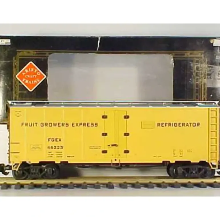 Here is a Aristo-Craft 46223 Fruit Growers Express Reefer. This car features front and rear operating AAR knuckle couplers, detailed freight car trucks/wheelsets with individual springs, operating body doors with moveable latch, operating roof-hatch doors with moveable latch, three-dimensional ladders on ends and sides, brass grab-railings, full underframe, including Air Brake System components, simulated wood-grain flooring, realistic paint colors and railroad markings. Minimum 4 foot curve required. This car is equipped with plastic wheels.