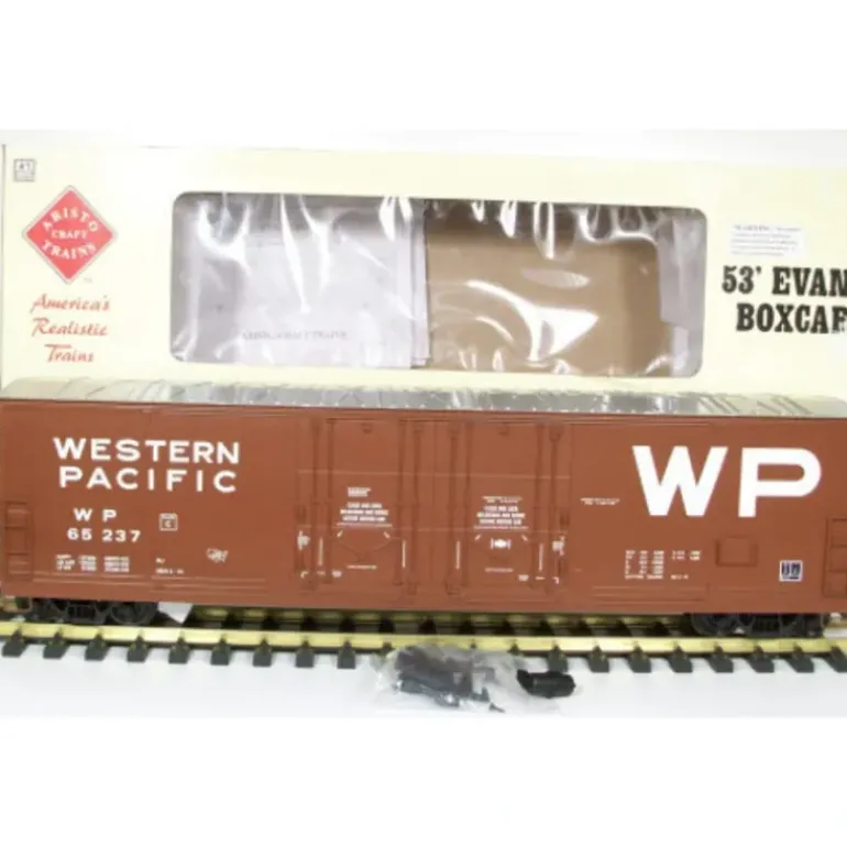 Here is an Aristo-Craft 50092P Western Pacific 53′ Evans Boxcar. Features include Sprung roller bearing style trucks with rotating bearing caps, Operating AAR-Design knuckle coupler, Detailed underframe includes air brake system components, Realistic painting & authentic detailing, three-dimensional ladders on sides and ends, Highly detailed plug doors with realistic door hardware, and it measures approximately 22″ Long.