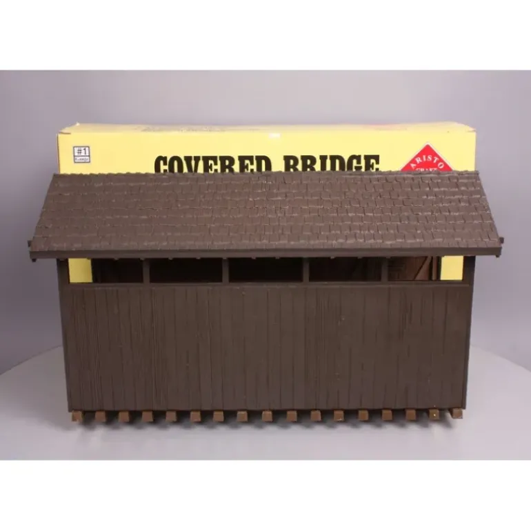 Here is an Aristo-Craft 7101 G Scale Covered Bridge. This bridge comes pre-assembled and and can be used for indoor and outdoor use. This measures 19.5″ long, 11″ tall, and 9″ wide.