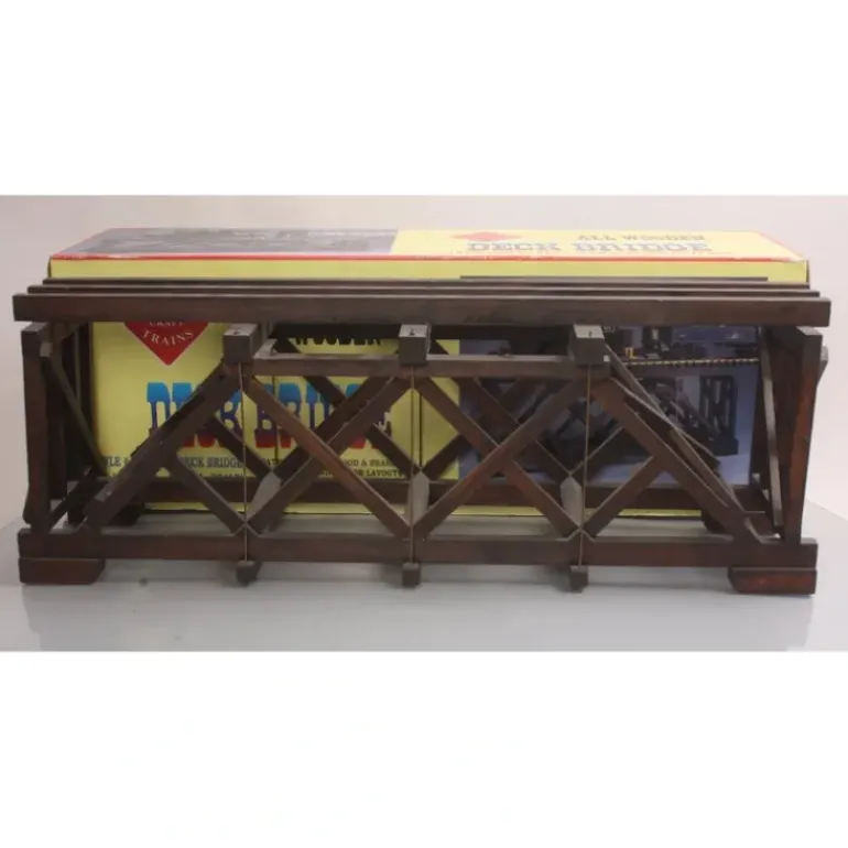 Here is an Aristo-Craft 7121 Wooden Deck Bridge. It comes pre-assembled and may be used for indoor and outdoor use. It measures 24 inches long.