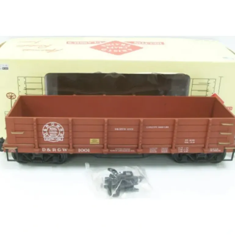 Here is an Aristo-Craft 81001 G Scale Denver & Rio Grande Western Wood Gondola Car. Features include plastic knuckle couplers, plastic trucks, and wheels.