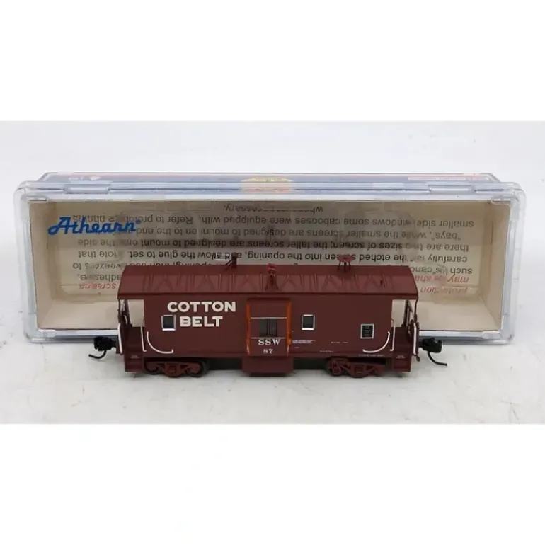 This is an Athearn 23231 N Scale SSW Cotton Belt Bay Window C-50-7 Caboose #87. Key Features: Fully assembled and ready for your layout,Now packaged in a stackable jewel case,New truck tooling including axle-mounted generator,Fully detailed underbody,Prototypical details like antenna, marker lights, smoke jack and vent,Separately applied wire grab irons,End walkway tread,Clear window glazing,McHenry scale knuckle spring couplers installed.