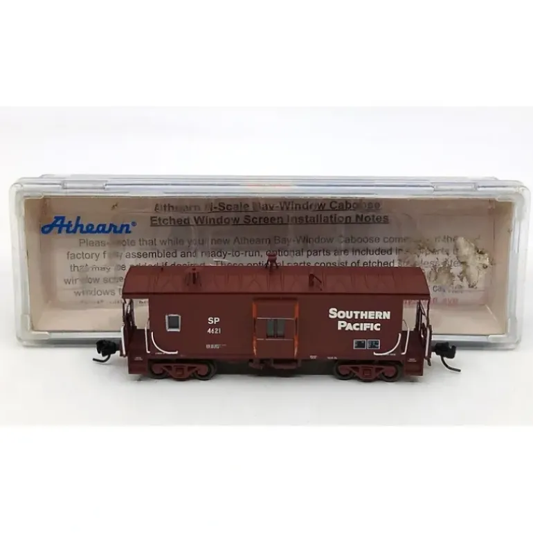 This is an Athearn 23244 N Scale Southern Pacific Bay Window C-50-7 Caboose #4621. Key Features: Fully assembled and ready for your layout,Now packaged in a stackable jewel case,New truck tooling including axle-mounted generator,Fully detailed underbody,Prototypical details like antenna, marker lights, smoke jack and vent,Separately applied wire grab irons,End walkway tread,Clear window glazing,McHenry scale knuckle spring couplers installed.