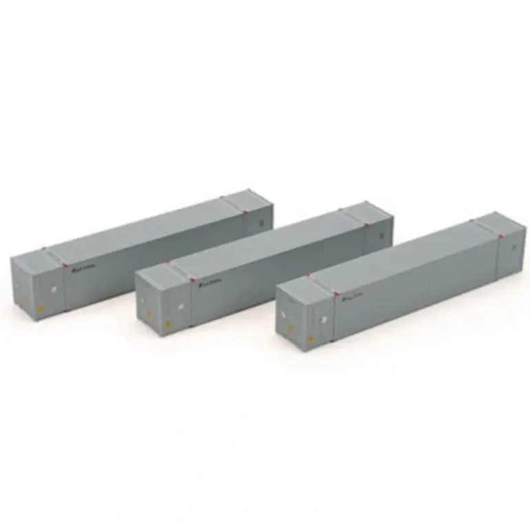 These containers are fully assembled and ready for your layout. There are three included in each package. They feature horizontal ribbed fronts, easy stackability, separately applied door closure rods, individual numbering, and razor sharp painting and printing.