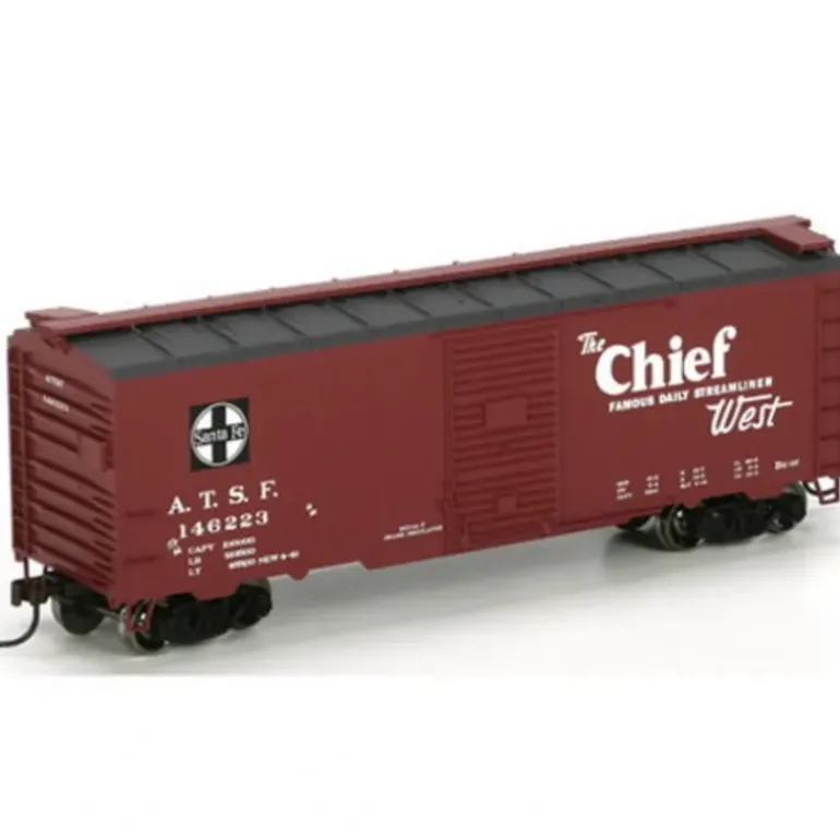 Here is an Athearn 70037 HO Santa Fe/Chief RTR 40′ YSD Box Car #146223. Fully assembled and ready to operate. Based on Model Die Casting tooling. Weighted for optimum performance. Razor sharp painting and printing. Machined RP25 profile 33 metal wheels. Magnetically operated knuckle couplers.