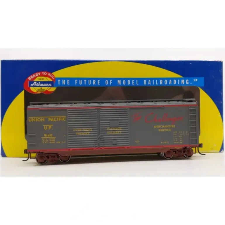 Here is an Athearn 70883 HO Union Pacific-Challenger 40′ Double Door Boxcar #9140. This boxcar is fully assembled and ready for your layout. It features razor sharp printing and painting, machined RP25 profile 33 inch metal wheels, McHenry scale knuckle spring couplers, and it is weighted for optimal performance.