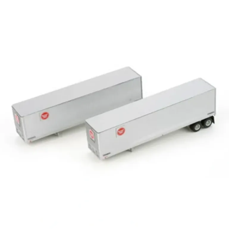 This trailer is fully assembled and ready for your layout. It features a beaded side body, sliding rear bogie, interchangeable landing gear that can be raised or lowered, razor sharp painting and printing and upgraded former A-Line tooling. There are two trailers in each package.