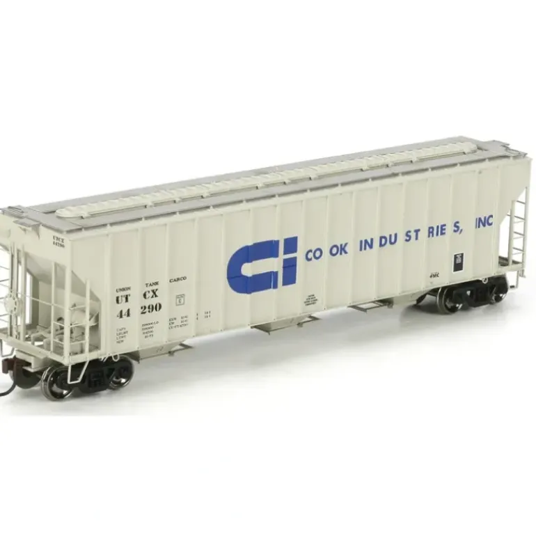 This is Athearn HO Scale Ready-to-Roll FMC 4700 Covered Hopper Car – Cook/UTCX #44290. Features: Fully assembled and ready for your layout Highly upgraded with etched metal walkways, new ladders and end detail Factory installed roofwalk and side sill grab irons Separately applied brake piping Two outlet grate variations (per prototype) Razor sharp painting and printing Weighted for optimal performance Machined RP25 profile 36 metal wheels McHenry scale knuckle spring couplers installed.
