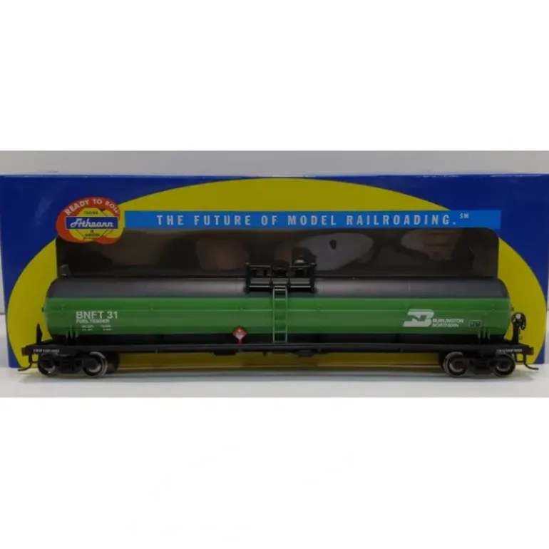 Here is a Athearn 76152 HO Burlington Northern Fuel Tender 62” Tank Car #31. This car comes fully assembled and ready for your layout. It features razor sharp painting and printing and is weighted for optimal performance. It has machined RP25 profile 33 inch metal wheels and McHenry scale knuckle spring couplers installed.