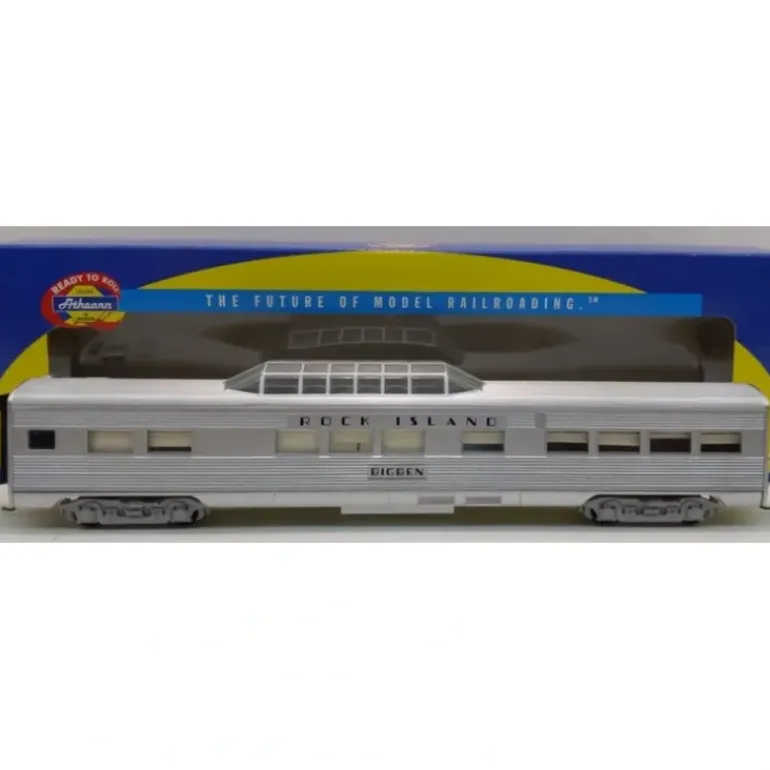 Here is an Athearn 7923 HO Rock Island Big Ben Streamlined Vista Dome. This car features plastic trucks, operating knuckle couplers, metal wheels and axles.