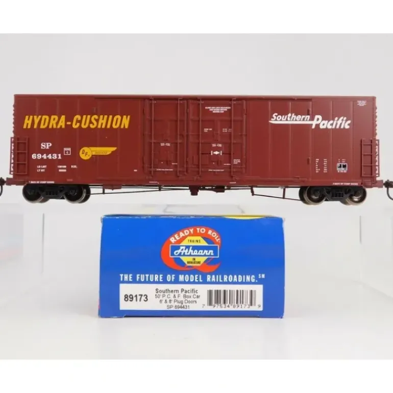 Here is a Athearn 89173 HO Scale SP PC&F Plug Door 50′ Boxcar #694431. This boxcar is fully assembled and ready for your layout. It features a highly detailed underbody including full cushion underframe, machined metal wheels with Ready to Roll sideframes, razor sharp painting and printing, McHenry scale knuckle spring couplers, and it has been weighted for optimal performance.
