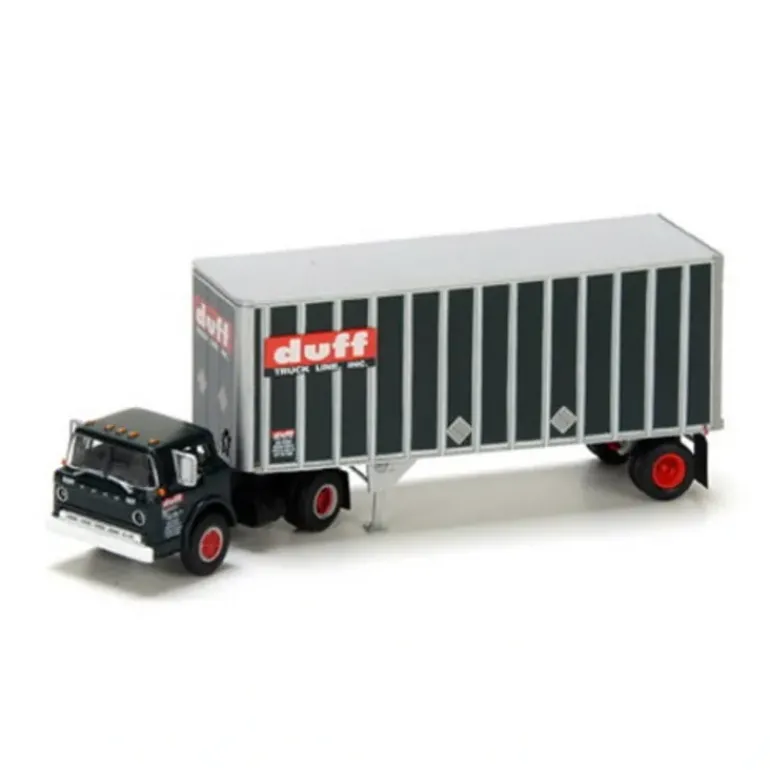 This is a Athearn 90982 HO Duff Truck Lines Ford C & 28′ Wedge Trailer. This vehicle is a Ford licenced model and is factory assembled with many applied detail parts. It features razor sharp painting and printing, a detailed cab interior, and rubber tires.