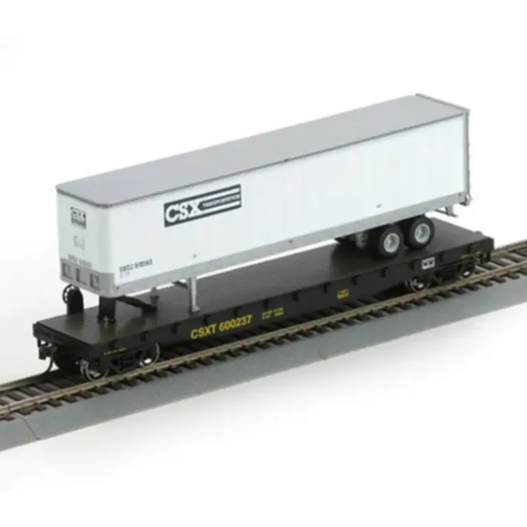 This car is fully assembled and ready for your layout. It features a 45 foot removable trailer load, machined RP25 profile 33 inch metal wheels, magnetically operated knuckle couplers, and it is weighted for optimal performance.
