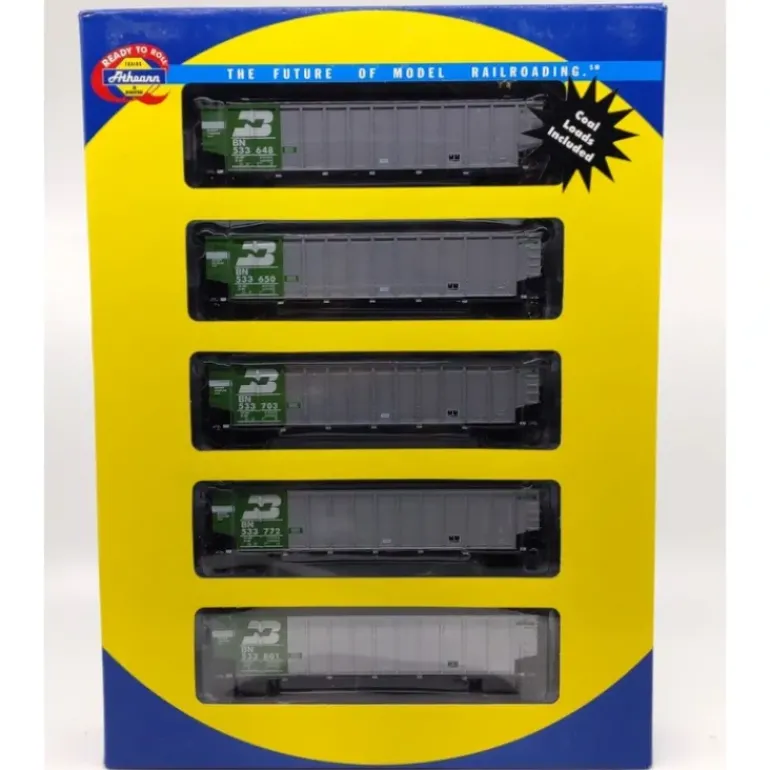 Here is an Athearn 93035 HO Scale Burlington Northern Coalporter #5 (Set of 5). Features include plastic construction, plastic trucks, magnetic knuckle couplers, metal wheels and axles.