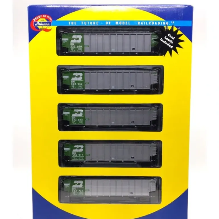 Here is an Athearn 93036 HO Scale Burlington Northern Coalporter #6 (Set of 5). This car features plastic construction, plastic trucks, metal wheels and axles, and knuckle couplers. Road numbers: 533640, 533663, 533675, 533715, & 533721.