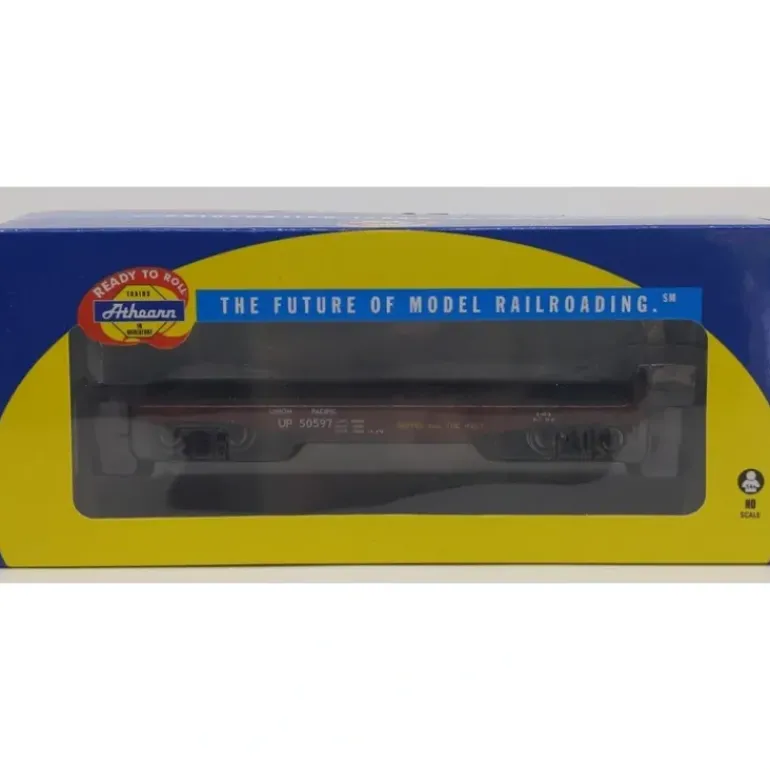 This is a Athearn 96348 HO Scale Union Pacific 40′ Flatcar #50597. This car comes fully assembled and ready for your layout. It is weighted for optimal performance, machined RP25 profile 33 inch metal wheels, and McHenry scale knuckle spring couplers.