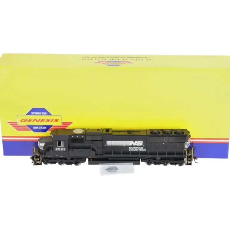 This is an Athearn G6114 HO Norfolk Southern SD-70 Diesel Locomotive #2553. This locomotive has been researched from the prototype to match specific units. It features a Genesis driveline with dynamically balanced five-pole skew wound motor and dual flywheels, directional, constant lighting, working ditch lights, Cab interior, and factory installed Celcon handrails.