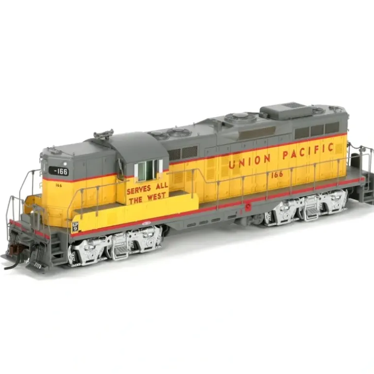 This is Athearn G62424 UP #166 HO GP9. Its key features are: Genesis driveline with dynamically balanced five pole skew wound motor and dual flywheels