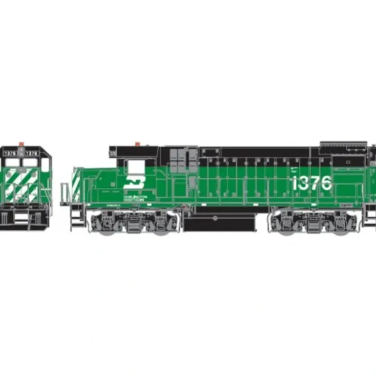 This is Athearn Genesis HO Scale GP15-1 w/DCC & Sound – Burlington Northern/Ex-Frisco #1391. Features: Factory installed SoundTraxx Tsunami sound and DCC decoder Tsunami sounds are compatible with both DCC and DC operation Genesis driveline with dynamically balanced five pole skew wound motor and dual flywheels All-wheel drive and electrical pick-up Detailed fuel tank Wire grab irons Etched metal lift rings Etched metal radiator intake grilles and top radiator screeens Celcon handrails Sand lines, air lines and other seperately applied underframe details Sliding cab windows Etched metal windshield wipers McHenry scale knuckle spring couplers installed. Additional Information: By the mid-1970s thousands of first generation locomotives were showing the age after 20 years or so of service. Long since replaced on most Class 1 mainlines by newer more powerful locomotives, old GP7s and GP9s had been reassigned to locals, road switchers, and yard jobs. To extend the life of these locomotives without buying new ones, many railroads had begun rebuilding programs. The GP15 series was introduced by EMD in 1976 as an alternative to these rebuilding programs. As originally conceived it was intended that old units be traded in and components such as the trucks reused to make the cost comparable to a rebuilt unit. The GP15-1 was a 1,500 horsepower, 4-axle unit using a non-turbocharged 12-cylinder 645 engine. It differed from the rest of the contemporary geeps by having roof mounted radiators and side intakes like the tunnel motor locomotives. There were two major external differences in the GP15-1 production. C&NW and Frisco opted for car body air intakes like a GP7, while Missouri Pacific and Conrail chose a central air intake like the contemporary Dash 2 series. Missouri Pacifics last order replaced the generator with an alternator. In 1982, Chessie System (C&O) acquired a new model, the GP15T. It was similar to the last GP15-1s with a central air intake and an alternator, but differed by having a turbocharged 8-cylinder 645 engine and dynamic brakes. Apalachicola Northern also bought GP15Ts, but their three did not have dynamic brakes and had car body air intakes.
