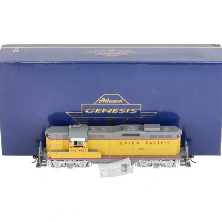 Here is an Athearn G78100 HO Scale Union Pacific GP-9 Powered Diesel Locomotive #143. NEW FEATURES: All-new LED lighting, Rubber MU hoses for durability. UP FEATURES: Different slogan on each side of cab per prototype, Early coupler cut bar, Appropriate MU stand per prototype, Full skirts above fuel tank, MU catch boxes with footboards, Front and rear early Pyle headlight, Dynamic brake, Winterization hatch, 1,200 gallon fuel tank. LOCOMOTIVE FEATURES: Trainline and MU hoses, Coupler cut levers, Drop steps unless noted, MU stands, Nub style walkway tread, Bell placement & type per prototype, Fine-scale handrails for scale appearance, Wire grab irons, Lift rings, Windshield wipers, See through cab windows and full cab interior, Etched metal radiator intake grilles and fan grilles, Air tanks mounted below sill unless noted, Detailed fuel tank with fuel fillers, fuel gauges, breather pipes, and retention tanks, Blomberg-B trucks with appropriate bearing caps, Sander lines, Speed recorder unless noted, Fully-assembled and ready-to-run, DCC-ready features Quick Plug plug-and-play technology with 21-pin NEM connector, Scaled from prototype resources including drawings, field measurements, photographs, and more, Genesis driveline with 5-pole skew wound motor, precision machined flywheels, and multi-link drivetrain for trouble free operation, All-wheel electrical pickup provides reliable current flow, All-wheel drive with precision gears for smooth and quiet operation, Wheels with RP25 contours operate on, Bidirectional constant LED lighting, Heavy die-cast frame for greater traction and more pulling power, Packaging securely holds the model for safe storage, Minimum radius: 18. SOUND EQUIPPED MODELS ALSO FEATURE: Onboard DCC decoder with SoundTraxx Tsunami2 sound, Sound units operate in both DC and DCC, Full DCC functions available when operated in DCC mode, Engine, horn, and bell sounds work in DC, All functions NMRA compatible in DCC mode, Excellent Slow speed control, Operating lighting functions with F5 and/or F6, Program a multiple unit (MU) lashup with lead unit only horn, bell, and lights, Many functions can be altered via Configuration Value (CV) changes, CV chart included.