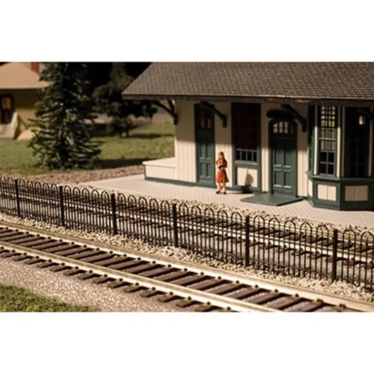 The hairpin fence was commonly used by railroads to keep people from crossing the tracks in station areas. This fence can also be used around parking lots, parks, cemeteries and homes. It features easy to assemble parts, no glue required, loop pickets, and spear finials.