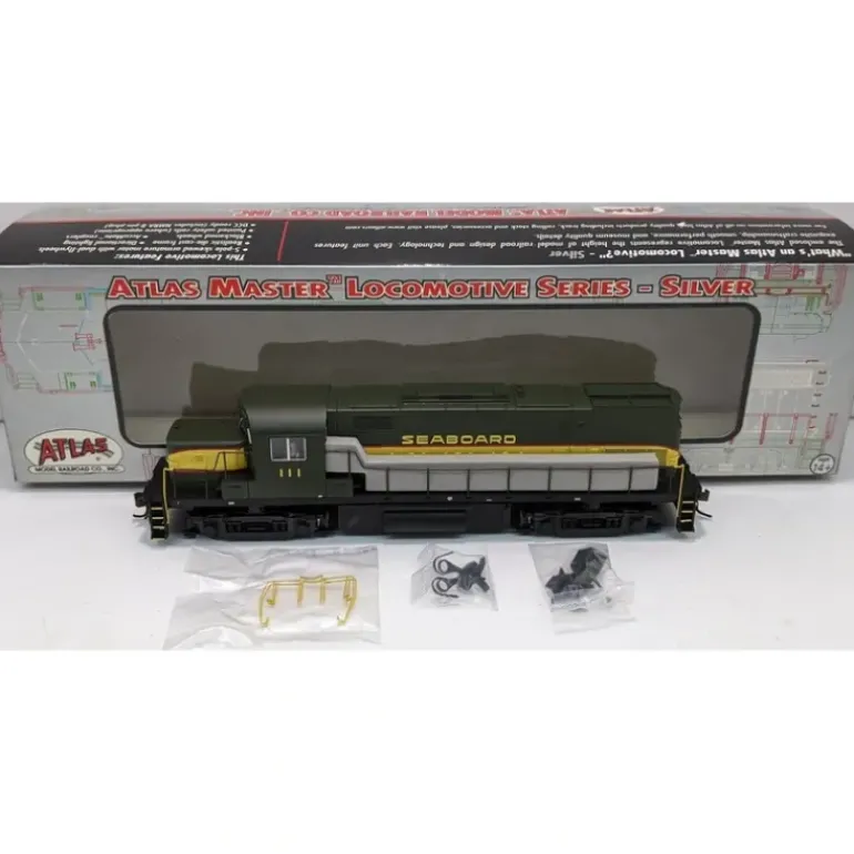 Here is an Atlas 10000050 HO Scale SAL C420 Phase 2A Diesel Locomotive #111. This locomotive features flat or step pilots that are used where appropriate, low nose headlight in low position used when appropriate per road name, 3,100 or 2,400 gallon fuel tank used when appropriate per road name, separately applied scle detail parts (windshield wipers, metal grab irons, coupler cut levers, multiple-unit hoses, train line hoses, fine scale handrails, drop steps, cab sun shades), see through step detail on sill, etched metal radiator walkway, painted crew members, factory equipped with AccuMate Proto-Couplers, five pole skewwed armature motor with dual flywheels for optimum performance at all speeds, and directional lighting with golden white LEDs.