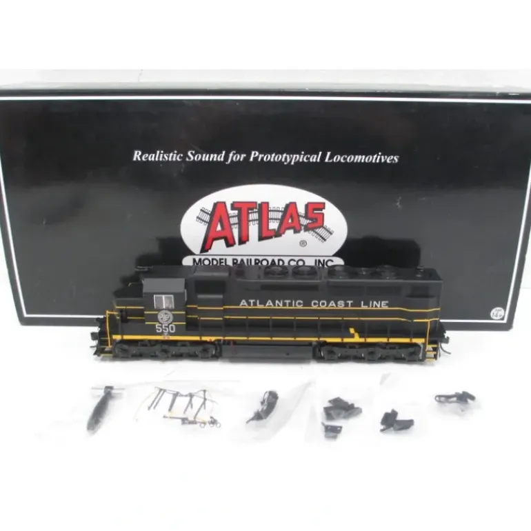 Here is an Atlas 10000283 ACL SDP35 Low Nose Locomotive w/DCC #550. This locomotive comes with a five-pole skewed armature motor with dual flywheels for optimum performance at all speeds. Its many features include directional lighting, golden-white LEDs, realistic die-cast under-frame, factory-equipped AccuMate knuckle couplers, detailed cab interior with crew, marker lights with separate lenses, scale fans and grille detail, separately-installed scale windshield wipers, metal grab irons and fine scale handrails, and a snowplow (included but not installed). Also included as per the prototype is a flat dust bin or raised dust bin.