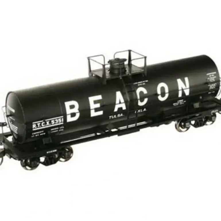 Here is an Atlas 1086-1 HO RTCX Beacon Petroleum Co 11,000 Gallon Tank Car #5351. This tank car features finely molded handrails, tank fittings, safety placards, 50 ton friction bearing trucks with AccuMate couplers, accurate lettering and painting, and a platform where appropriate.