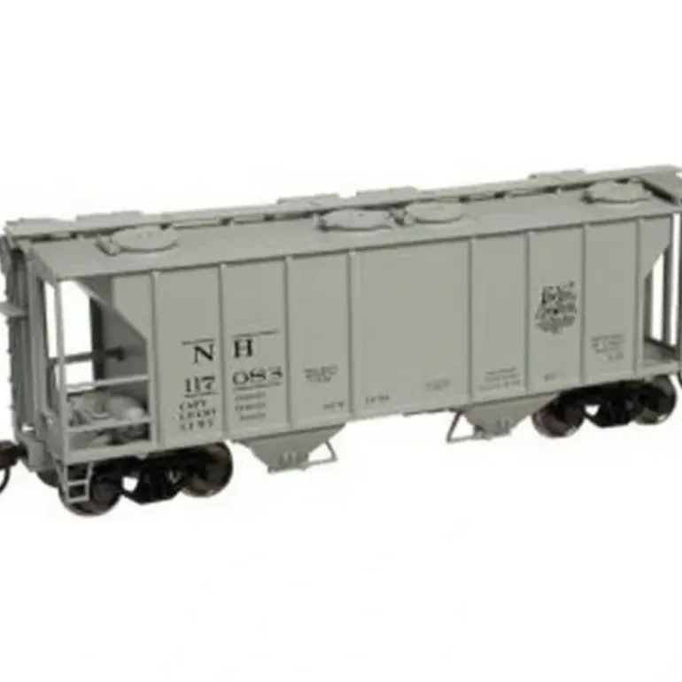 Here is an Atlas 11295 HO NH Trainman PS-2 Covered Hopper #117023. This two-bay covered hopper car design was built by Pullman-Standard starting in the late 1940s with production continuing into the 1950s. This car features eight round roof hatches for quick loading. Two large gravity gates were used to discharge the commodity as quickly as possible. Capacity is rated at 2,003 cubic foot