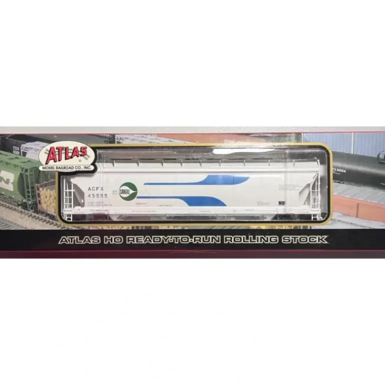 Here is an Atlas 1514-2 HO Scale Cargill Pressureaide Centerflow Hopper #45555. This freight car features a durable plastic construction with separately applied detail trim parts, plastic trucks, metal wheels and axles, knuckle couplers, and attractive decoration.
