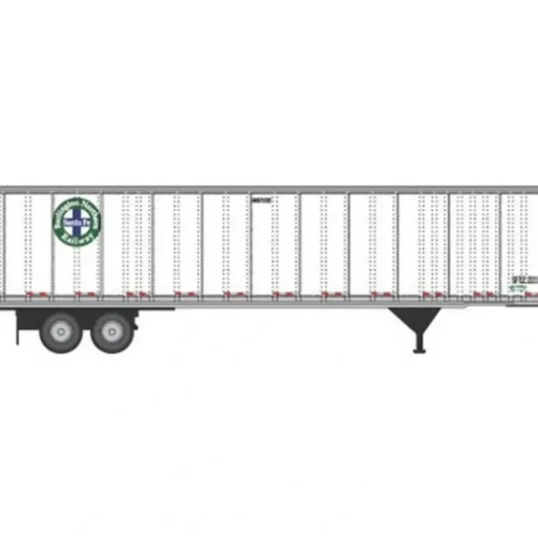 This trailer features movable landing gear, prototypical top rail reinforcement strip, improved design on the door to roof interface, hinges and latches, rear bumper detail, rivets, and accurate detail.