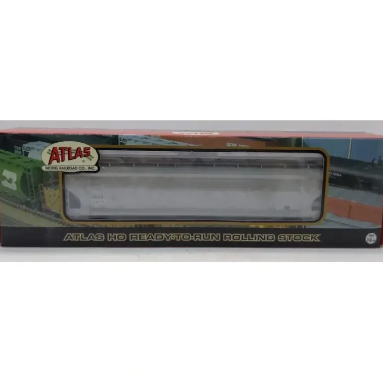 This hopper features eight full-width panel body with nine weld seams, etched metal roof walks, two continuous hatch designs, longitudinal mounted air reservoir, gravity outlets, blackened metal wheels, accurate painting and printing, and 100-ton roller-bearing trucks and body mounted AccuMate couplers with screw-attached coupler pockets.