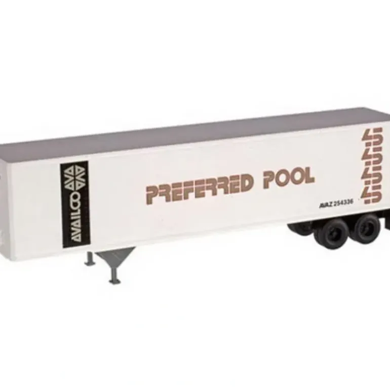 This trailer features two sets of landing gear – fully extended or retracted, hinges and latches, rivets, and rear bumper detail.