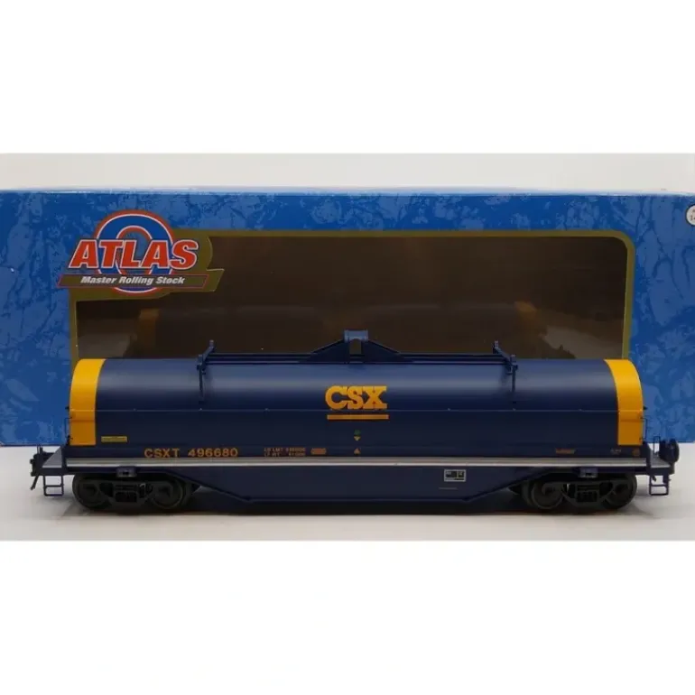 Here is an Atlas 3001702-7 CSX 42′ Coil Steel Car #496680 (3 Rail). This car features die-cast metal sprung trucks, metal wheels and axles, and operating knuckle couplers.
