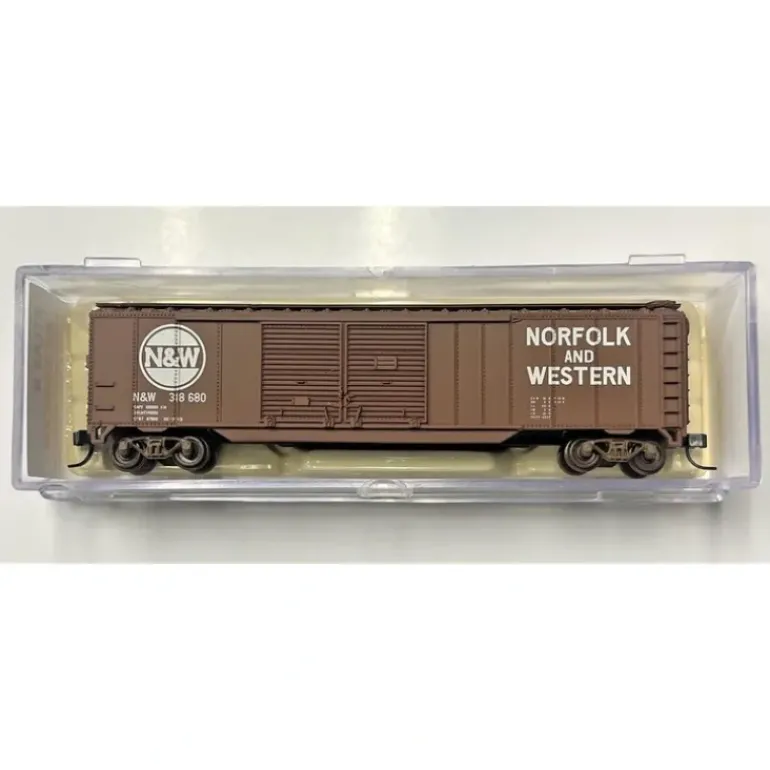 Here is an Atlas 36434 N Scale Norfolk & Western 50′ Double Door Boxcar #318680. This car features plastic trucks, knuckle couplers, plastic wheels and axles.