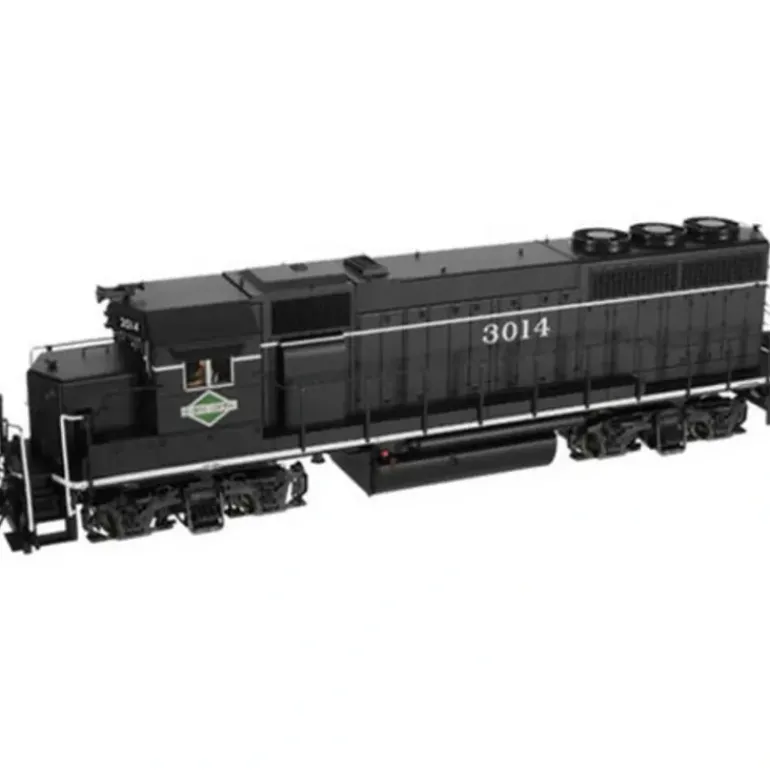 This locomotive features directional lighting, walkway safety tread, blackened metal wheels, scale speed motor, factory equipped with AccuMate knuckle couplers, dynamic brakes, golden white LEDs.