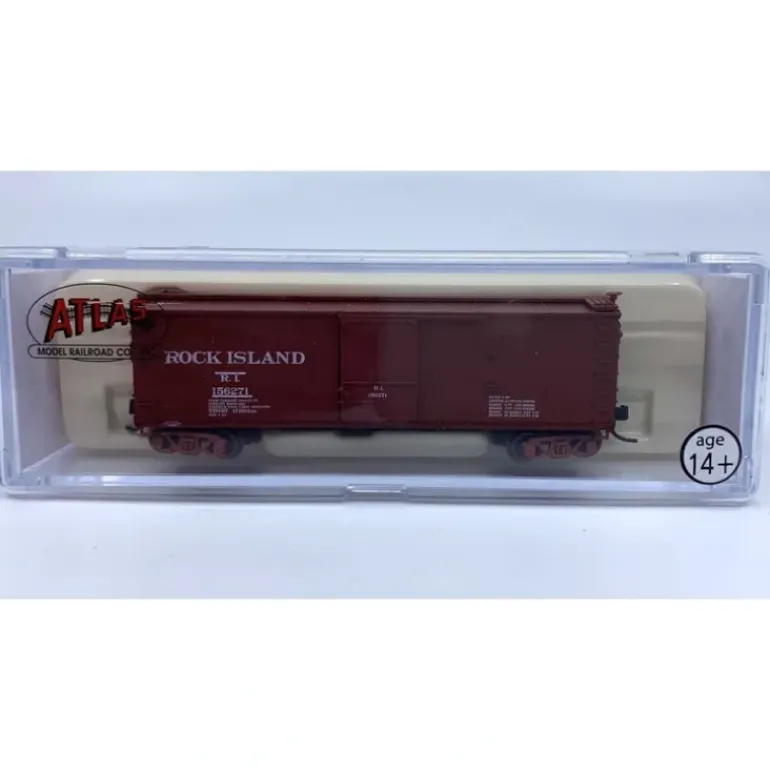 Here is a Atlas 45753 N Rock Island Double Sheathed Boxcar #156271. Features include: plastic body, trucks, and couplers.