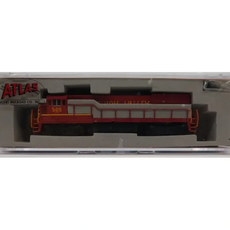 Here is an Atlas 45916 N Scale Lehigh Valley U23B Diesel Locomotive #505. This locomotive features a durable plastic construction, metal wheels, plastic trucks, detailed trimming & knuckle couplers. Powered by a V12 FDL prime mover, the 2250 h.p. U23B was GEs intermediate-sized four-axle road-switcher of the late 1960s through the mid 1970s. The U23Bs direct competitor during this period was the very successful EMD GP38. In 10 years of production from 1968 through 1977 a total of 481 units were produced, making this the second best seller of GEs Universal Series locomotives. The first units were delivered to the Delaware & Hudson in August and September 1968. CSX predecessors Chesapeake & Ohio and Louisville & Nashville had a combined fleet of 120 units, giving CSX one of the larger active fleets in later years. Penn Central, Santa Fe and Missouri Pacific also purchased sizeable fleets of U23Bs. Primary spotting features include a stepped-out radiator section and two sets of three tall engine access doors near the center of the long hood. During production, the U23B was equipped with various truck side frames, including Blomberg trucks from EMD trade-in locomotives, AAR-style trucks, or GEs own four-axle FB2 truck.