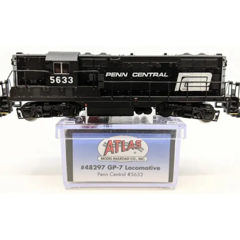 Here is an Atlas 48297 N Scale Penn Central GP-7 Diesel Locomotive #5633. Introduced in 1949, the Electro-Motive 1500hp GP-7 combined the machinery of the F7 with a hood-type carbody that offered high visibility and easy engine access. The GP-7 was used in pulling every conceivable type of train and was sometimes substituted for part of a set of cab units. The GP-9 utilized a 1750hp engine and was visually similar to the GP-7. This locomotive features a scale speed motor, powered low friction drive, blackened metal wheels, dual brass flywheels, directional lighting, golden white LEDs, and AccuMate couplers.