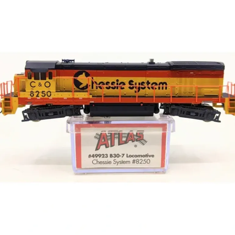 Here is an Atlas 49923 N Scale C&O Chessie System B30-7 Diesel Locomotive #8250. This locomotive features directional lighting, full pilots, dual brass flywhees, low friction mechanism, body mounted AccuMate magnetic knuckle couplers, walkway saftey treads, painted handrails, white LEDs, and improved slower speed motor for closer to scale speeds. Please check the photos for a detailed look at this item.
