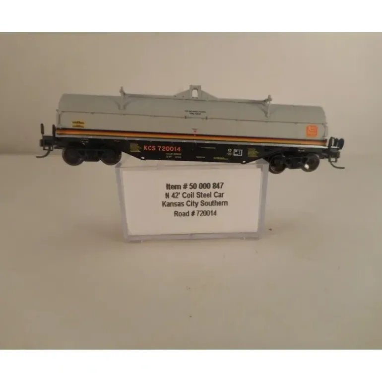 This is Atlas 50 000 847 N 42′ Coil Steel Car KCS #720014/black/red/yellow/gray. The increased volume of coiled steel transportation gave rise to a new purpose-built freight car. Previously rolls of coiled-steel had generally traveled in specially equipped gondola cars. In the 1960s a lighter type of car emerged specifically for hauling coils of steel in an integral trough. The car type gained popularity and eventually over 17,000 cars were built. Atlas model replicates a 42 design with a distinctive fishbelly side sill.